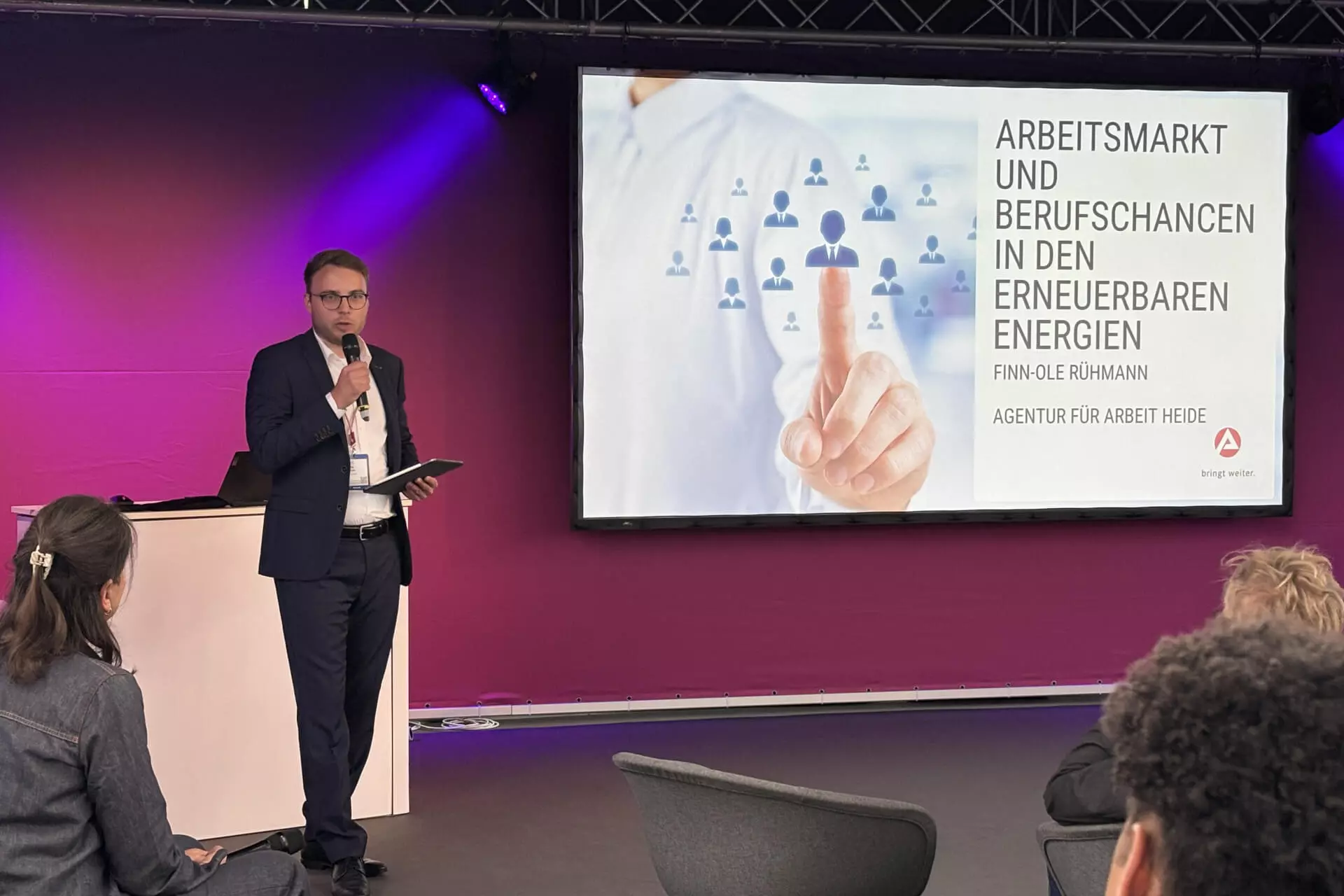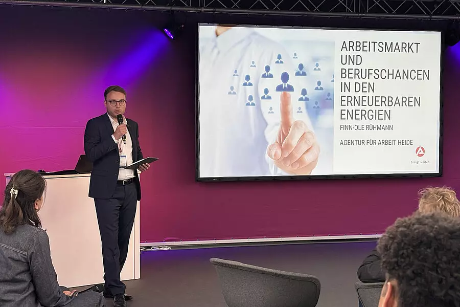 Finn-Ole Rühmann, Heide Employment Agency, spoke about the job market and career opportunities in renewable energies. Finn-Ole Rühmann: ‘The energy transition is creating jobs. Their proportion in relation to all jobs is steadily increasing. However, the shortage of skilled workers could slow down the energy transition.’