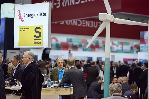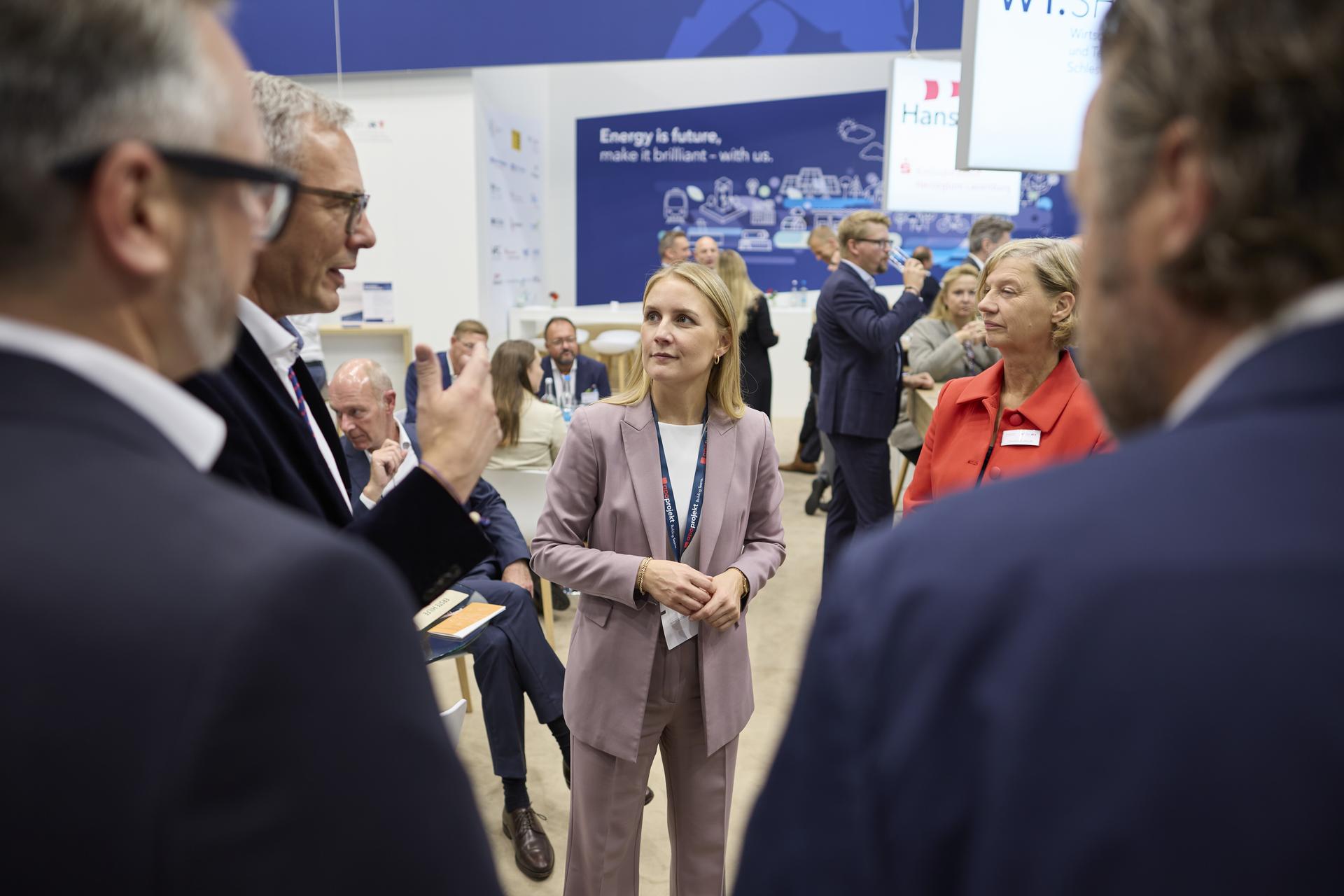 Lively discussions at the Schleswig-Holstein stand: Joschka Knuth, State Secretary MEKUN (left), Dr Tom Schelo, Copenhagen Infrastructure Partners (centre)